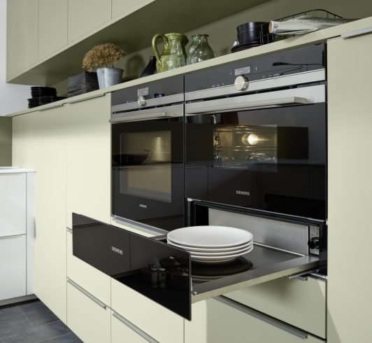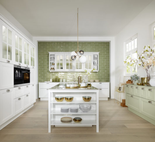 Les façades à cadre, les présentoirs et un bloc de cuisine avec un plan de travail en granit créent un style campagnard nostalgique qui se voit donner une interprétation contemporaine dans un concept de couleur avec beaucoup de contrastes. Des touches de couleur individuelles ajoutent des accents frais, comme un buffet ou une combinaison d’armoires autoportantes dans des tons vifs, donne à cette cuisine une sensation de luminosité.